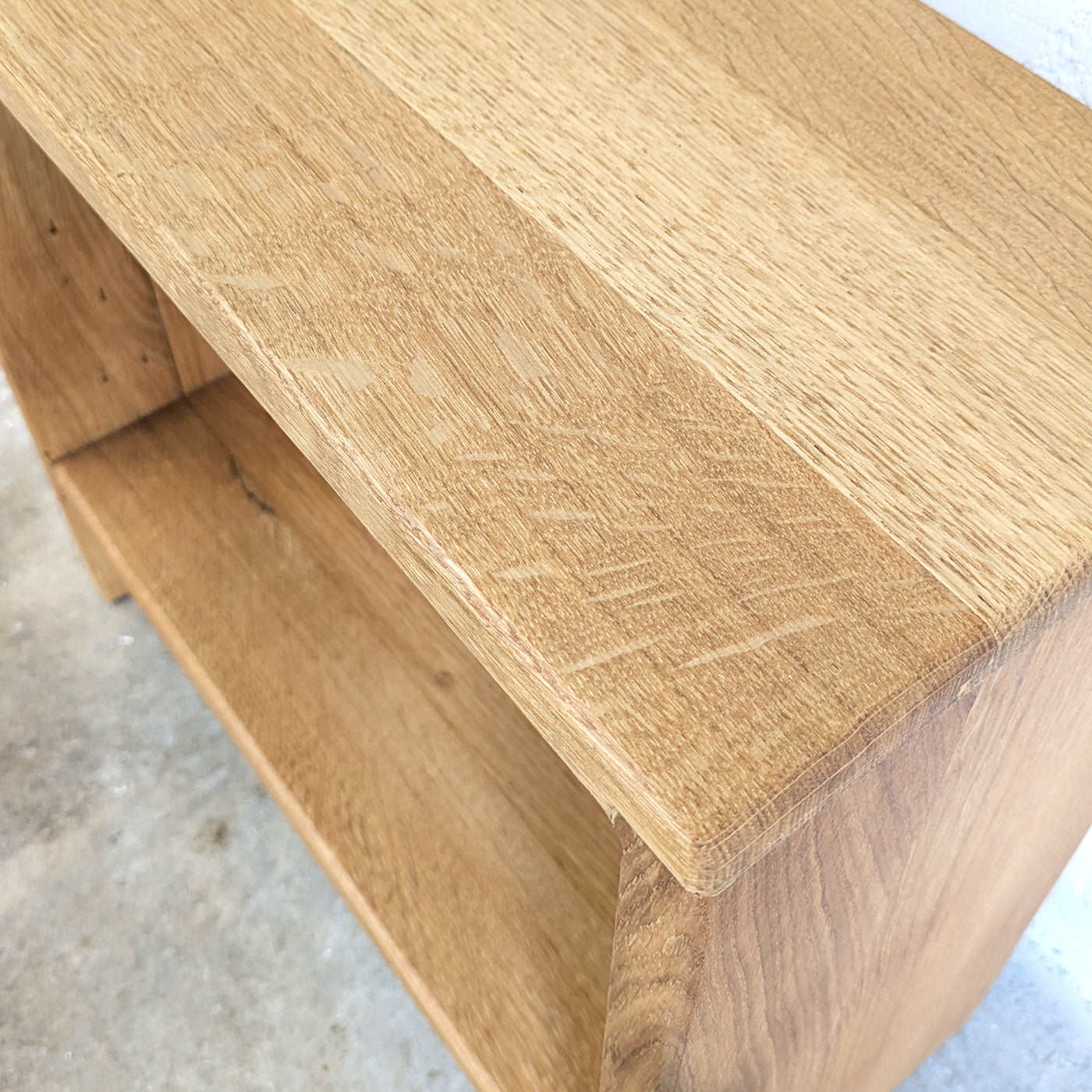 Ce banc est fabriqué à partir de parquet en chêne massif ancien, soigneusement réemployé et assemblé à l’atelier.